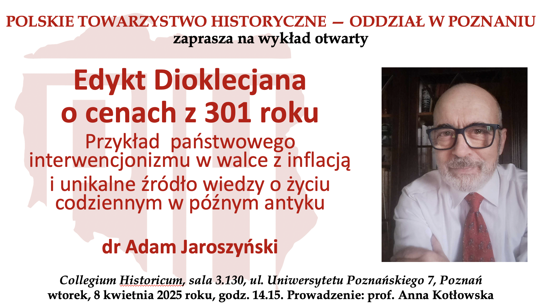 Poznański oddział PTH zaprasza na wykład otwarty pt.  Edykt Dioklecjana o cenach z 301 roku. Przykład państwowego interwencjonizmu w walce z inflacją i unikalne źródło wiedzy o życiu codziennym w późnym antyku, który wygłosi  dr Adam Jaroszyński.