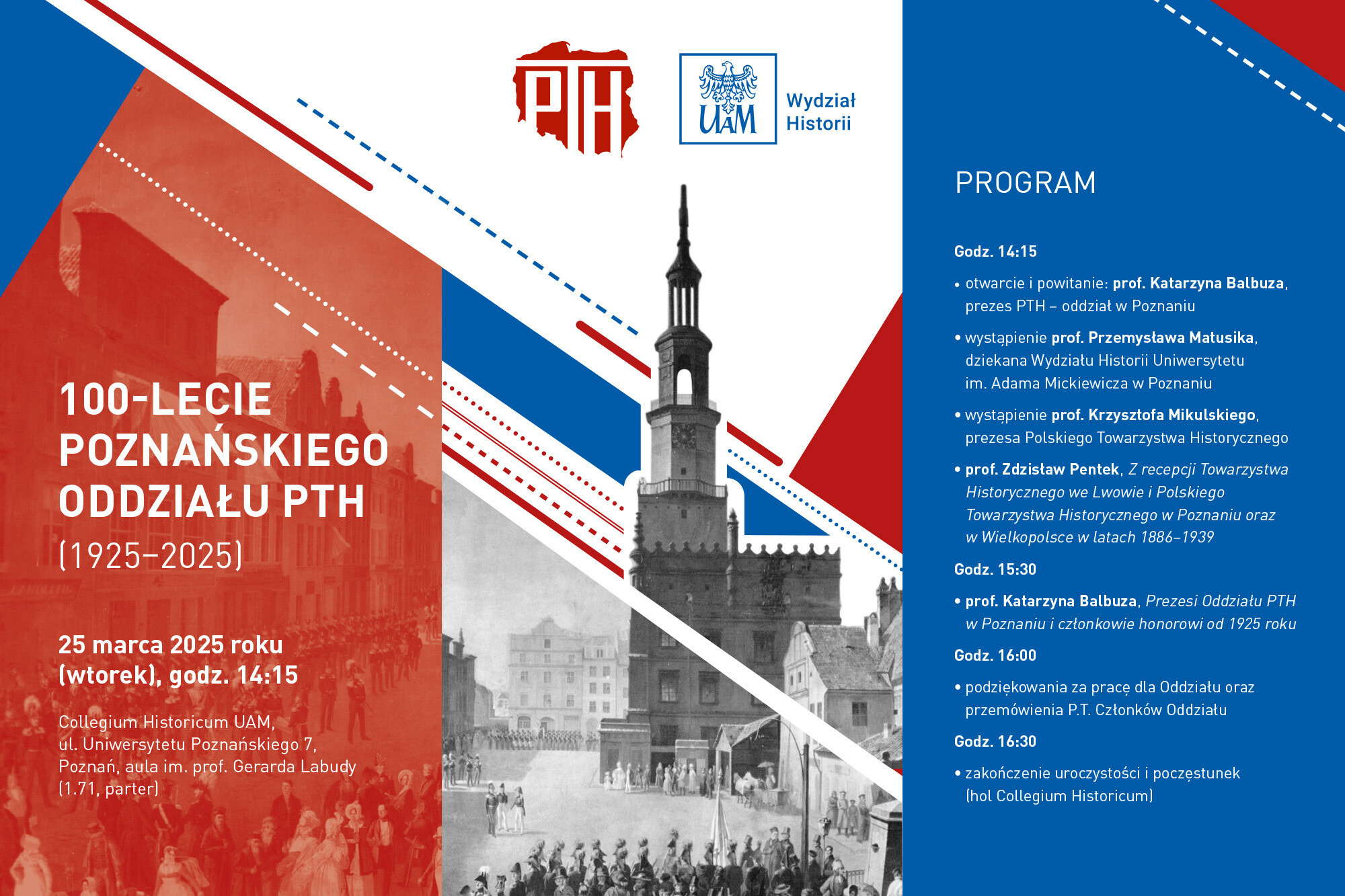 Polskie Towarzystwo Historyczne – Oddział w Poznaniu oraz Wydział Historii Uniwersytetu im. Adama Mickiewicza w Poznaniu zapraszają na obchody 100-lecia poznańskiego Oddziału PTH